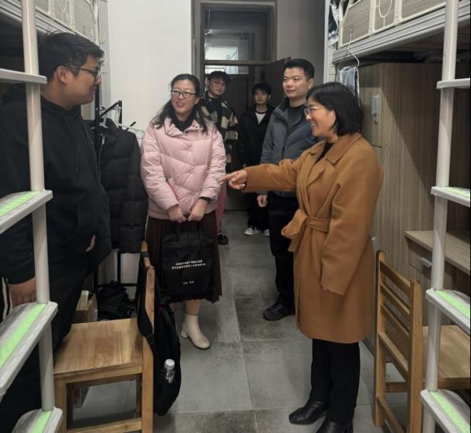 在学生宿舍,贺美兰仔细查看同学们的居住环境,重点留意了寝室用电规范、物品堆放等安全细节,反复叮嘱大家要时刻绷紧安全弦,养成良好的生活习惯,共同维护安全、整洁、有序的寝室环境。随后,她亲切地与同学们“唠家常”,细心询问同学们的学习生活情况以及对未来生活的期待与规划,叮嘱同学们保持良好心态,互帮互助,共同进步,快乐学习成长。她还嘱咐同学们若有思想困惑、生活困难、学业难题、求职升学疑问等,及时与辅导员、班主任、专业教师等沟通交流,学校也将为学生成长成才创造更好的条件,营造更好的氛围。