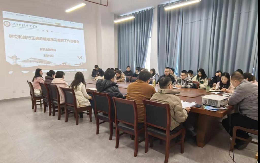 根据学校党委的统一部署安排,3月10日下午,财税金融学院党总支组织召开了树立和践行正确政绩观学习教育工作部署会议。深入学习贯彻习近平总书记关于树立和践行正确政绩观的重要论述,对学院开展树立和践行正确政绩观学习教育进行了部署。党总支班子成员、全体党员参加会议。