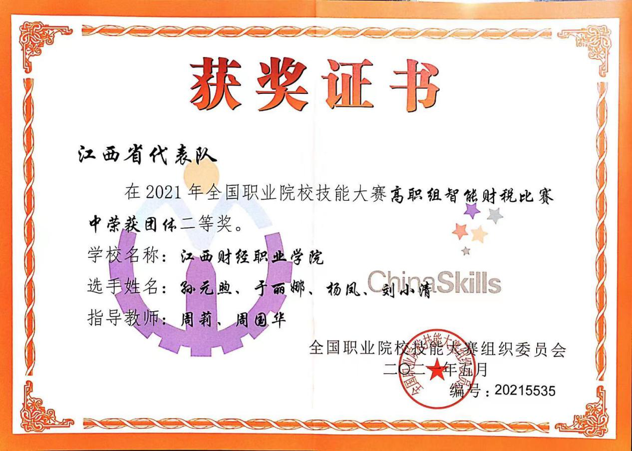 2021年7月19日至20日,全国职业院校技能大赛(高职组)“智能财税”赛项在湛江市奥林匹克体育中心成功举办。经过激烈竞争,我校孙元煦、于丽娜、杨凤、刘小清4名同学(指导老师:财税金融学院周莉、数字经济学院周国华)组建成的江西省参赛代表队最终以总分第7的成绩荣获“团体二等奖”。